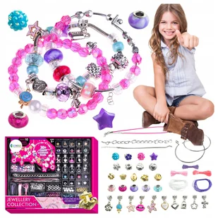 - Koraliki, charmsy i bransoletki - setki możliwości W zestawie znajdziesz ponad 250 koralików w różnych kształtach – perłowe, stożkowe, owalne, gwiazdki i motylki, 28 efektownych charmsów, 4 srebrne bransoletki, materiałowy naszyjnik, sznurki i wstążkę.