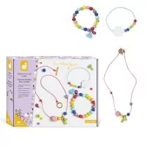 Zestaw kreatywny do tworzenia biżuterii Tęczowe amulety francuskiej marki JANOD pozwoli stworzyć w sumie 3 sztuki biżuterii: 1 naszyjnik i 2 bransoletki. W jego skład wchodzą 34 kolorowe drewniane koraliki, 2 drobne złote koraliki, duży biały koralik w kształcie chmurki, 3 zawieszki-chwościki, zawieszka-biedronka, 2 sznureczki i 2 złote zapięcia. W kilka chwil Twoje dziecko może stać się kreatywnym jubilerem! Projektowanie i tworzenie biżuterii to godziny angażującej i jednocześnie uspokajającej, wyciszającej zabawy, a po skończonej pracy powstałe dzieła mogą jeszcze długo służyć jako ozdoby lub podarunki dla bliskich. Do zestawu dołączona jest szczegółowa instrukcja jak wykonać poszczególne ozdoby.