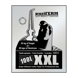 Drożdże XXL 100 l to produkt angielskiej firmy puriFerm. Opakowanie zawiera specjalną kulturę drożdży, witaminy oraz mikroelementy które umożliwiają pełną fermentację nastawu o objętości 100 l i zawartości cukru 25 kg. Charakterystyka: przeznaczone do fermentacji 100 l nastawu cukrowego pracują w temperaturze 21-29 Co czas fermentacji to około 4-6 dni końcowy poziom alkoholu - do 18%