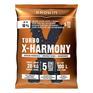 Drożdże Turbo X-Harmony - 360 g X-Harmony to aktywne suszone drożdże z pożywką, stworzone przez polskich specjalistów w Laboratorium Browin i przetestowane na setkach nastawów, które spełnią oczekiwania nawet najbardziej wymagających pasjonatów fermentacji. W opakowaniu 360 g pozwalają uzyskać do 18% alkoholu w 5 dni na 100 litrów przy 28 kg cukru, gwarantując stabilny, spokojny przebieg fermentacji bez burzliwych wybryków. Drożdże te nie przegrzewają się, co docenią doświadczeni użytkownicy, a każdy proces jest powtarzalny i stabilny, dzięki czemu efekt końcowy zawsze zadowala. X-Harmony maksymalnie wykorzystują cukier, nie marnując go, co przekłada się na pełne odfermentowanie i doskonałe parametry trunku. Dodatkowo łatwo się klarują, co wyróżnia je na tle innych drożdży.