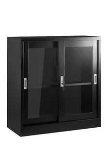 Biurowa szafka metalowa XD-018 z przesuwnymi drzwiami Szafka metalowa XD-018 to idealny wybór do biura, jeżeli szukamy miejsca na dokumenty i segregatory. Szafka wykonana jest z metalu,którego grubość przed pomalowaniem wynosi 0,5 mm. Szafka biurowa lakierowana jest proszkowo na czarny kolor, a dzięki zastosowaniu tego typu malowania materiał jest doskonale zabezpieczony przed wilgocią, a także uszkodzeniami mechanicznymi. Szafka posiada szklane fronty, które otwierane są przesuwnie, w ten sposób nie potrzebujemy dużej ilości miejsca, by mieć do niej łatwy dostęp. Dodatkowo drzwi szafki wyposażone są w zamek, dzięki czemu wszystkie przechowyne przedmioty będą bezpiecznie zamknięte.