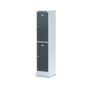 najpopularniejszy typ metalowej szafki ubraniowej podstawa o wysokości 12 cm konstrukcja spawana z blachy stalowej o grubości 0,6 mm wzmocnienia na drzwiach chroniące przed przedostaniem się do szafki z użyciem siły skuteczna wentylacja wg normy DIN 4547 każdy przedział zawiera półkę, drążek ubraniowy i 2 haczyki plastikowe metalowe zawiasy umożliwiają otwarcie drzwi pod kątem 100°, drzwi są wyposażone w spowalniacze zamykania zamek cylindryczny z 2 kluczami