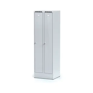 najpopularniejszy typ metalowej szafki ubraniowej podstawa o wysokości 12 cm konstrukcja spawana z blachy stalowej o grubości 0,6 mm wzmocnienia na drzwiach chroniące przed przedostaniem się do szafki z użyciem siły skuteczna wentylacja wg normy DIN 4547 każdy przedział zawiera półkę, drążek ubraniowy i 2 haczyki plastikowe metalowe zawiasy umożliwiają otwarcie drzwi pod kątem 100°, drzwi są wyposażone w spowalniacze zamykania zamek cylindryczny z 2 kluczami