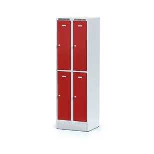 najpopularniejszy typ metalowej szafki ubraniowej konstrukcja spawana z blachy stalowej o grubości 0,6 mm wzmocnienia na drzwiach chroniące przed przedostaniem się do szafki z użyciem siły skuteczna wentylacja wg normy DIN 4547 każdy przedział zawiera drążek ubraniowy i 2 haczyki plastikowe metalowe zawiasy umożliwiają otwarcie drzwi pod kątem 100°, drzwi są wyposażone w spowalniacze zamykania zamek obrotowy do zastosowania kłódki na numer albo klucz