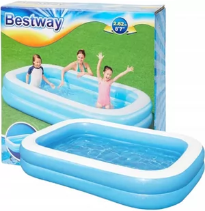 BASEN DMUCHANY PROSTOKĄTNY RODZINNY 262x175x51CM ⭐NADMUCHIWANY BASEN BESTWAY 262 x 175 x 51 cm⭐ Nadmuchiwany basen Bestway 262 x 175 x 51 cm to doskonały wybór na letnie upały! Ten 2-pierścieniowy basen wystarczy tylko nadmuchać i nalać wodą, aby móc wskoczyć do niego i cieszyć się zabawą we własnym ogrodzie. Basen pomieści aż 778 litrów wody, co pozwoli na zabawę nawet większej grupie przyjaciół. Basen wykonany jest z wytrzymałego plastiku o niebieskim kolorze, a jego kształt jest prostokątny. Nadaje się do użytku zarówno wewnątrz, jak i na zewnątrz, a odpowiedni wiek dla użytkowników to od 6 roku życia. Ten basen Bestway nie jest dostarczany z akcesoriami, ale można dokupić je osobno.
