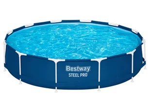 Bestway Zestaw basenowy Steel Pro Frame, 366 x 76 cm, z pompą Opis produktu wytrzymały 3-warstwowy materiał DuraPlus™ pasek PVC dla dodatkowej stabilności ścian bocznych możliwość podłączenia systemu filtrującego (Ø 32 mm) stalowa rama: połączenie za pomocą systemu FrameLink System™ łączniki T z tworzywa sztucznego zabezpieczenie antykorozyjne powłoka zapobiegająca przywieraniu (Frosted Frame) wygląd: : kolor: ciemnoniebieski wewnętrzna wyściółka w kolorze błękitnym montaż i demontaż: łatwy montaż bez użycia narzędzi zintegrowany zawór spustowy z adapterem do węża ogrodowego Cechy produktu table{width:100%;}td{padding-right: 30px; padding: 0.5rem; border-bottom: 0.0625rem solid #e3e4e5;} tr: nth-child(odd) {background-color: #F2F3F4;} Wymiary: