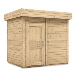 drewno lipowe Grubość całkowita dachu: 84 mm Materiał pokrycia dachu: papa wzmocniona Wyposażenie sauny: 2x ławka, obudowa pieca Oświetlenie: 2x lampa porcelanowa Piec: