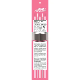 Elektroda Most 6013, śr. 2,5 mm, 0,5 kg. Elektroda rutylowa z domieszką celulozy do spawania stali niestopowych. Doskonałe własności spawalnicze. Łuk jest stabilny, spawanie z minimalną ilością odprysków.