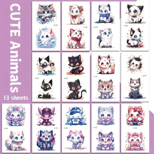 TEMU 13 Arkuszy Świecących w Ciemności Tatuaży z Uroczymi Kotami - Niebieskie Wzory Zwierząt o Świetlistym Efektie z Uroczymi Motywami Potworów