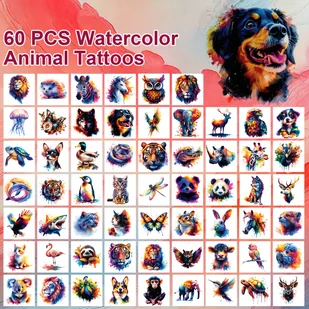 TEMU FTVLTAT 60szt. Tymczasowe Tatuaże z Akwareli Zwierzęta, 1.96x1.96 Cala - Urocze Wzory Zwierząt dla Dorosłych, Indywidualnie Zapakowane na Ramę i
