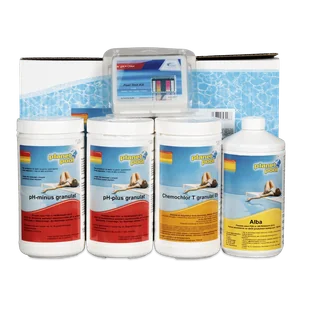 Zestaw produktów do pielęgnacji wody basenowej metodą chlorową. Stosowanie zestawu startowego Starter Set poleca się dla wygody użytkowników, dla basenów do około 20 m3 wody. Jest to zestaw, który kompleksowo zadba o czystość i higienę wody basenowej. W zestawie tym znajduje się: ph plus granulat, ph minus granulat, alba, T granulat 65 oraz miernik fotometryczny i ABC basenowe.
