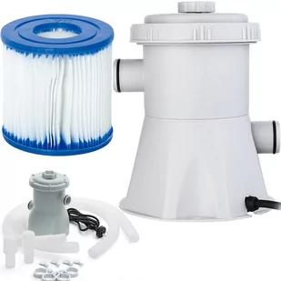 Pompa filtrująca do basenu + Filtr do pompy + Węże + Sitka, Zestaw XXL Jest to najważniejszy element wyposażenia basenu. Pozwala na utrzymanie czystej wody. Wszystkie pływające nieczystości są wciągane przez pompę i osadzają się na filtrze. Sam filtr powinien być regularnie czyszczony i wymieniany. Dodatkowo do zestawu dodajemy węże zaciski oraz sitka na nieczystości, które pozwolą utrzymać odpowiednią czystość wody w basenie.