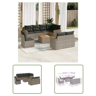 9-częściowy zestaw sof ogrodowych z poduszkami z szarego polirattanuTen zestaw sof ogrodowych jest idealnym dodatkiem do ogrodu, patio lub dziedzińca. Zapewnia wygodne i zachęcające miejsce do rozmów z rodziną i przyjaciółmi lub po prostu relaksu i cieszenia się życiem na świeżym powietrzu. Wytrzymały materiał: rattan PE, znany również jako polirattan, to wytrzymały, łatwy w pielęgnacji materiał syntetyczny o wyglądzie naturalnego rattanu. Charakteryzuje się niską wagą i jest łatwy w czyszczeniu.