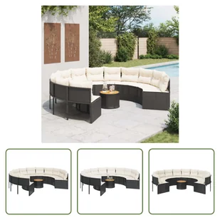Sofa ogrodowa ze stołem i poduszkami, okrągła, czarny polirattanTa okrągła sofa ogrodowa jest idealnym dodatkiem do ogrodu, patio lub dziedzińca. Zapewnia wygodne i zachęcające miejsce do rozmów z rodziną i przyjaciółmi lub po prostu relaksu i cieszenia się życiem na świeżym powietrzu. Wytrzymały materiał: rattan PE, znany również jako polirattan, to wytrzymały, łatwy w pielęgnacji materiał syntetyczny o wyglądzie naturalnego rattanu. Charakteryzuje się niską wagą i jest łatwy w czyszczeniu.
