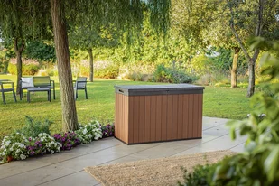 Pojemna i stylowa skrzynia to idealne rozwiązanie do przechowywania akcesoriów ogrodowych, poduszek czy narzędzi, pomagając utrzymać porządek na tarasie, balkonie lub w ogrodzie. Dzięki wbudowanym siłownikom jej otwieranie jest wygodne i lekkie, a opcja zamknięcia pozwala na bezpieczne przechowywanie. Wytrzymała konstrukcja sprawia, że może służyć także jako dodatkowe siedzisko. Faktura przypominająca drewno.