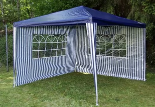 Komplet dwóch ścian z oknami do pawilonu 3 x 3 m - biało-niebieski jest i do innych pawilonów 3 x 3 m. Ścianki łatwe w montażu za pomocą pasków na rzepy lub haczyków. Materiał wodoszczelny oddychający - poliester PA powlekany, chroniący przed wiatrem.