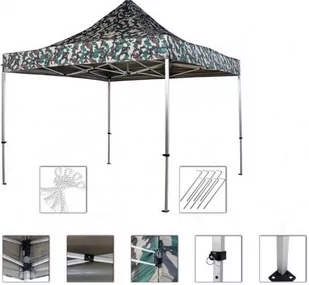 Dla dodatkowej stabilności i podparcia zastosowano powiększone nogi konstrukcji, materiał łączący z możliwością ekstrakcji oraz wysokiej jakości system klikalny z zabezpieczeniem zewnętrzną śrubą z napinaczem. Środkowa kolumna jest zintegrowana ze wspornikiem dachu. Dane techniczne: wymiary: 3 x 3 m waga pawilonu wraz z części: 16,7 cm bardzo mocne nogi teleskopowe: