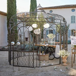 Ten artystycznie zaprojektowany, wykonany z odpornego na rdzę żelaza pawilon jest znakomitym dodatkiem do każdego miejsca na zewnątrz. Zachwyca delikatnymi liniami i szczegółowymi zdobieniami, które tworzą pełne romantyzmu i uroku tło. Solidny kopułowy dach przyciąga wzrok, wieńczy projekt i tworzy bajkową sylwetkę, która fascynuje zarówno w ciągu dnia, jak i w świetle księżyca. Niezależnie od tego, czy chodzi o intymną popołudniową przerwę na kawę, czy o centralny element świątecznego wydarzenia, ten pawilon oferuje zachęcające i stylowe schronienie na świeżym powietrzu.