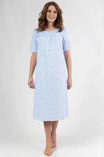 Bawełniana koszula nocna niebieska 013 wykonana z wysokiej jakości dzianiny, która zapewnia miękkość, przewiewność i komfort noszenia. Klasyczny dekolt zapinany na guziczki dodaje funkcjonalności i ułatwia zakładanie, a delikatnie marszczony karczek nadaje całości subtelnej elegancji. Krótki rękaw zapewnia swobodę ruchów, sprawiając, że koszula jest idealnym wyborem na ciepłe noce.