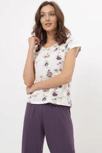 Damska bambusowa piżama STEFANIA Wygodne i delikatne w dotyku piżama STEFANIA to połączenie kobiecego stylu i wyjątkowego komfortu. Wykonana z naturalnego bambusowego włókna, które jest hipoalergiczne, antybakteryjne i przewiewne, zapewnia doskonały komfort przez cały rok. Lekkość i miękkość – bambusowe włókno gwarantuje jedwabisty dotyk na skórze. Stylowy wygląd – kwiatowy wzór na koszulce z krótkim rękawem dodaje romantycznego uroku. Swobodny fason – luźne spodnie w fioletowym odcieniu zapewniają wygodę i elegancję.