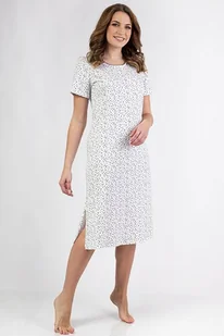 Koszula nocna Radka ma popularny wzór z małymi serduszkami i kwiatami. Koszula nocna wykonana jest w 100% z bawełny. Ma krótkie rękawy i okrągły dekolt, który jest ozdobnie obrębiony. Po bokach znajdują się rozcięcia. Jest w kolorze białym (ecru) i ma ciemnoszary wzór.