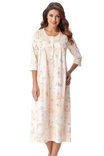 Klasyczna długa koszula nocna z rękawem 3/4 i zapięciem na guziki. Wygodna długa koszula nocna wykonana z przewiewnej bawełny. Koszula nocna posiada okrągły, rozpinany dekolt. Spokojny łososiowy kolor ze wzorem w kwiaty który oczaruje każdą kobietę. Dostępny jest również szlafrok Lea łososiowy z takim samym wzorem.