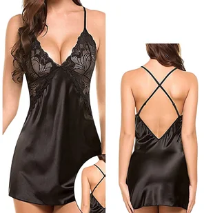 Najważniejsze cechy produktu: Design: Efektowne skrzyżowane ramiączka na plecach (typ Spaghetti Strap) odsłaniające łopatki, co nadaje całości lekkości i seksapilu. Materiał: Przyjemna w dotyku tkanina o satynowym połysku, która jest gładka i delikatna dla skóry. Zdobienia: Przód ozdobiony misterną, prześwitującą koronką w kwiatowe wzory. Długość: Mini (przed kolano) - idealna na ciepłe, letnie noce.
