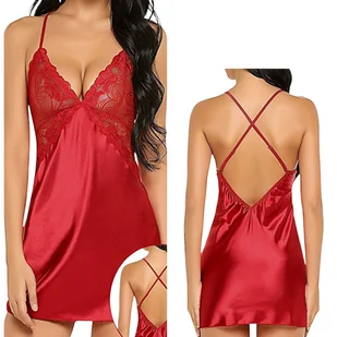 Atuty, które pokochasz: Tył: Efektowne, krzyżujące się na plecach cienkie ramiączka, które zmysłowo eksponują plecy i łopatki. Kolor: Intensywna czerwień (Red), symbolizująca energię i pasję. Komfort: Materiał jest gładki, śliski i przyjemny dla skóry, zapewniając wygodę podczas snu. Detale: Półprzezroczysta koronka na biuście idealnie współgra z satynowym dołem.