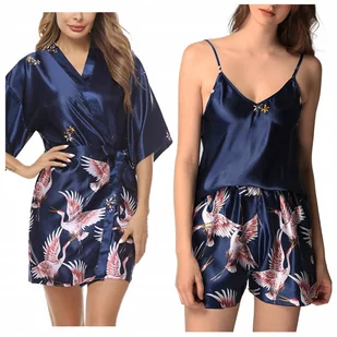Komplet szlafrok damski satynowy print top spodenki - XL