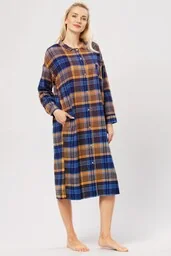 Cechy produktu: długa koszula nocna z zapięciem na guziki, wykonana z miękkiej flaneli 100% bawełnianej, obniżone ramię i kontrafałda dla swobody ruchów, kieszenie boczne i ozdobna kieszonka na piersi, energetyczne kolory złocistego miodu i granatu, Skład : 100% flanela bawełniana *kolor może nieznacznie różnić się w zależności od ustawień monitora