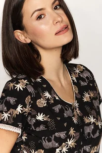 Wygodna damska koszula nocna urzeknie Cię niepowtarzalnym motywem i wysokiej jakości bawełnianym materiałem. Elegancka koszulka wykonana jest ze 100% bawełny, która jest bardzo przyjemna w dotyku, a jednocześnie doskonale przewiewna. Ma czarny kolor i ciekawe motywy na całej powierzchni. Koszula nocna damska ma dekolt w kształcie litery V i krótkie rękawy. W dekolcie ozdobna kokardka, rękawy podszyte porządną koronką.