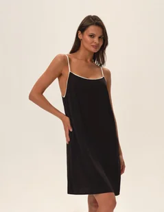 Koszulka nocna Jaina to połączenie klasyki i nowoczesności, gdzie głęboka czerń materiału kontrastuje z subtelnymi, białymi wykończeniami oraz ramiączkami. W...