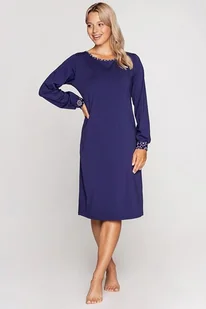 Koszula nocna Mina jest ciemnoniebieskiego koloru z delikatnym wzorem kwiatowym. Uszyta z luksusowej bawełny typu single jersey. Koszula nocna uszyta jest z bawełny single jersey z domieszką elastanu. Dzięki temu jest przyjemnie miękka, dopasowująca się i przewiewna. Długość ok.