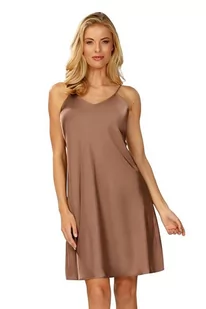 Koszula nocna marki DKaren wygląda rewelacyjnie. Koszula wykonana jest z wysokiej jakości satynowego materiału. Posiada wąskie, regulowane ramiączka. Dekolt ma kształt litery V. Koszulka ma jasnobrązowy kolor.