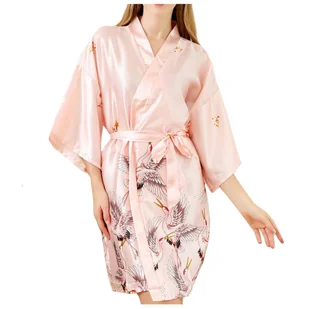 Elegancki szlafrok kimono z motywem żurawi Ten wyjątkowy szlafrok łączy subtelną elegancję z wygodą noszenia. Uszyty z miękkiego, satynowego materiału, delik...