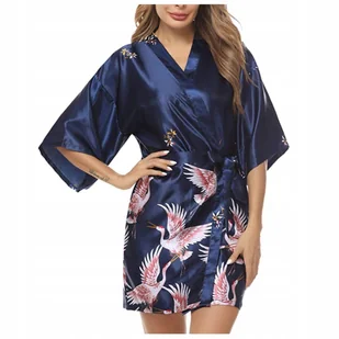 Elegancki szlafrok kimono z motywem żurawi Ten wyjątkowy szlafrok łączy subtelną elegancję z wygodą noszenia. Uszyty z miękkiego, satynowego materiału, delik...