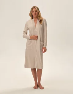 Damski kardigan Joyland to ciekawa propozycja uzupełniająca domową garderobę dla kobiet ceniących klasyczny design i wygodę. Szlafrok przypominający luźny sweter został uszyty z miękkiej w dotyku dzianiny. Przyjemnie otuli Twoje ciało, gdy w chłodniejszy poranek będziesz rozkoszować się smakiem ulubionej kawy na tarasie. Najpotrzebniejsze drobiazgi, np. telefon komórkowy, zmieszczą się w praktycznych kieszeniach.