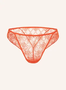 Przezroczyste wykonanie z tiulu. Podszycie nieprzezroczystym materiałem z przodu. Pas na wysokości bioder. Wysokie wycięcia na nogi. Środkowy szew dzielący z tyłu. Klin z bawełny. Średnie zakrycie pośladków. Kwiatowe hafty