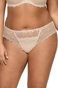 Koronkowe figi damskie beżowe AV 1030 wykonano z delikatnego haftu o motywie kwiatowym. Tył wykończony przezroczystym tiulem. Majtki świetnie dopasowują się do sylwetki.