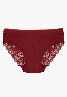 Bordowe Bawełniane Majtki Figi z Prążkowanej Tkaniny z Koronką Erqelia