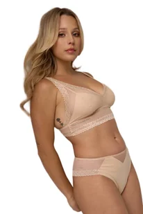 Koronkowe majtki brazyliany beżowe 211 wykonane z miękkiej bawełny, to idealne połączenie wygody i kobiecego stylu. Przód modelu zdobi delikatny tiulowy wstawiony trójkąt, który nadaje lekkości i subtelnej zmysłowości. Tył wykonany z transparentnej koronki o ażurowym wzorze pięknie podkreśla sylwetkę, dodając bieliźnie elegancji i lekkości. Komfortowy fason zapewnia swobodę noszenia na co dzień, jednocześnie zachowując estetyczny i zmysłowy wygląd.