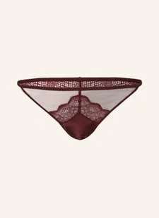 Przezroczyste wykonanie z koronki. Nieprzezroczysty materiał z przodu. Pas na wysokości bioder. Proste wycięcia na nogi. Środkowy szew dzielący z przodu i z tyłu. Klin z bawełny. Całkowicie zakryte pośladki. Satynowy materiał