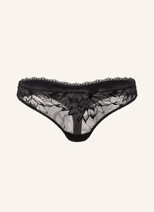 Przezroczyste wykonanie z koronki z przodu. Nieprzezroczysty materiał z tyłu. Pas na wysokości bioder. Wysokie wycięcia na nogi. Środkowy szew dzielący z tyłu. Klin z bawełny. Pas z koronkowym obszyciem