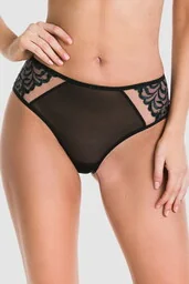 Figi pełne damskie Mediolano model Roma 19178 w czarnym kolorze. Perfekcyjne połączenie wysokiej jakości surowców i starannego wykonania. Przód i tył fig wykonane są z delikatnego tiulu, który sprawia, że bielizna jest nie tylko wyjątkowo miękka, ale także nie odznacza się pod obcisłymi ubraniami, dzięki starannie złożonej strukturze tiulu przy pośladkach. Boki fig są ozdobione bogatym haftem, nadając im elegancki charakter. Haft w formie rozetki subtelnie umieszczony jest także w tylnej części, co dodaje całości niepowtarzalnego uroku.