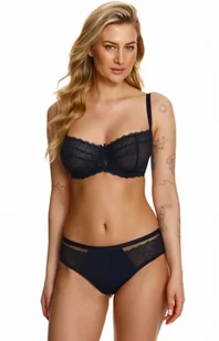 Figi damskie granatowe 2401 wykonano z eleganckiej koronki oraz gładkiej mikrofibry. Majtki świetnie dopasowują się do sylwetki i efektownie podkreślają pośladki.