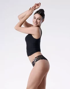 Figi o obniżonej linii bioder i koronkowym tyle, wykonane w technologii "Invisible Line", zapewniającej ultracienkie wykończenie brzegów. Posiadają bawełnianą wkładkę higieniczną, która zwiększa komfort. Skład: 89% poliamid, 10% elastan, 1% bawełna.