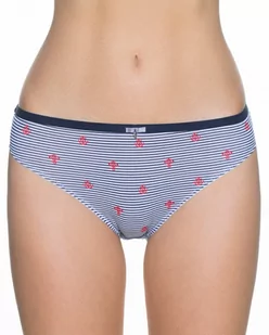 Figi damskie typu bikini, uszyte z wysokiej jakości bawełny (95%) w paski, w modnym marynarskim stylu. Pas wykończony płaską wygodną gumką, ozdobiony kokardką z zawieszką. Pakowane w pudełko po dwie sztuki (z dużą kotwicą oraz w małe kotwice).