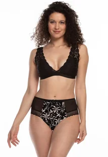 Figi damskie wysoka linia talli, zabudowane biodra, wzorzysta i jednolita bawełna. Po bokach transparentna siateczka, nogawki wykończone ażurową koronką. Skład: 95% bawełna, 5% elastan.