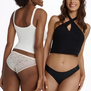 Dwupak majtek damskich Penny to zestaw, który sprawdzi się każdego dnia i w każdej sytuacji. Gwarantujemy, że te figi są tak wygodne, że zapomnisz o innej bieliźnie damskiej! Dzięki gładkim, klejonym brzegom doskonale dopasowują się do ciała, stając się niewidoczne pod ubraniem. Delikatna siateczkowa koronka na pośladkach dodaje bieliźnie pikanterii i kobiecości. wygodny krój bikini damskiego dwie sztuki w opakowaniu bawełniana podszewka Skład materiałowy: Materiał wierzchni: