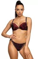 Czarne, koronkowe majteczki zdobione wstawkami z gładkiego tiulu. Przód z czerwonym akcentem w postaci efektownych kwiatuszków. Fason typu biodrówka. Skład: ...